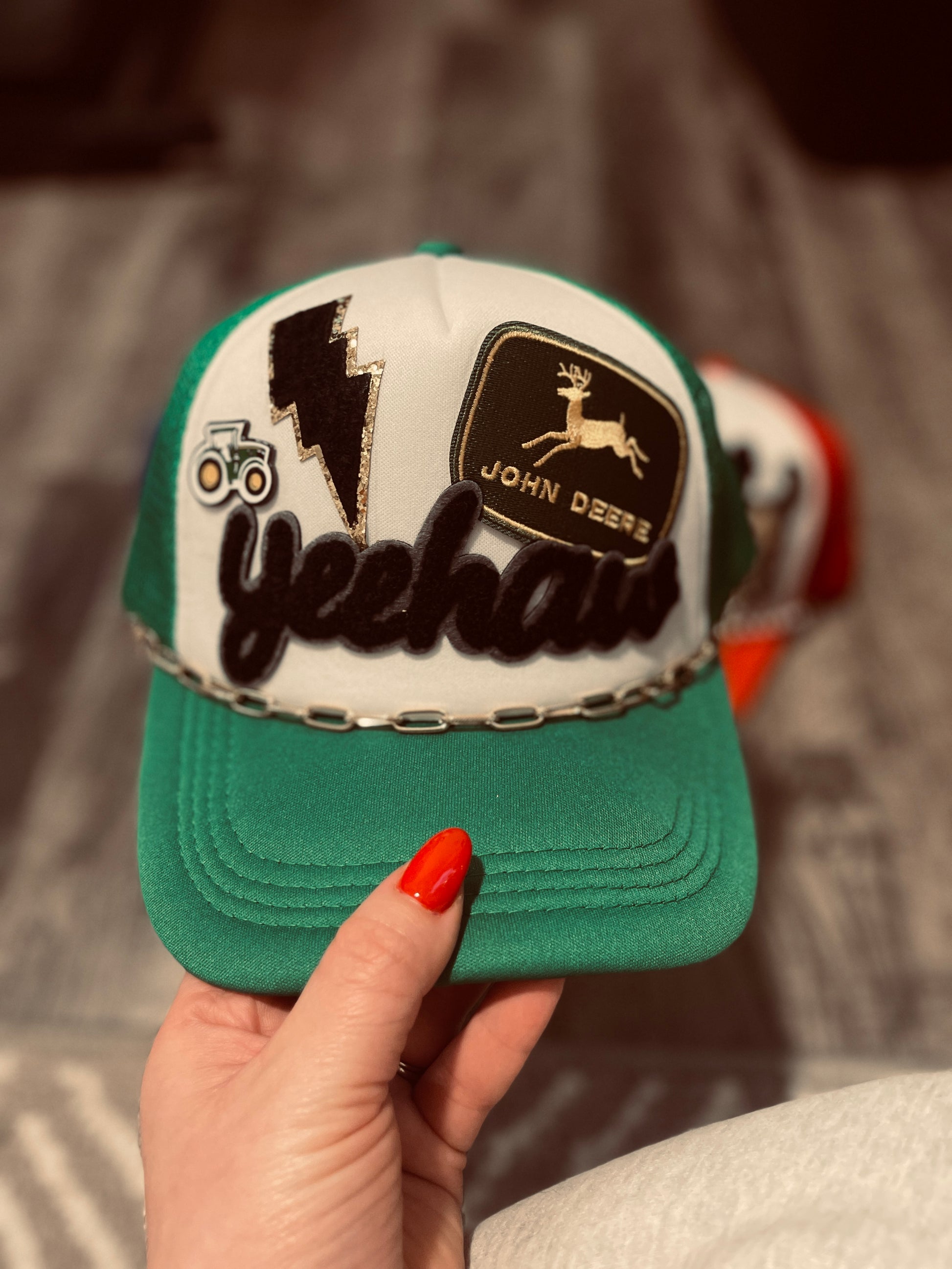 "Expertly crafted with a trendy style, the John Deere Green Trucker Hat is the perfect accessory for any outdoor enthusiast. Made with high-quality materials, this custom trucker hat will keep you looking and feeling cool while providing reliable protection from the sun. A must-have for any wardrobe."